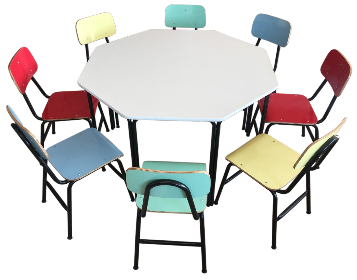 LJL5077 – Conjunto coletivo adulto 8 lugares, mesa com tampo em MDF 18mm com bordas envernizadas, estrutura monobloco em tubo 7/8, ch. 1.2, tratamento anti-ferrugem, pintura epóxi. Cadeira escolar adulto, assento e encosto em fórmica. Estrutura 7/8, tratamento anti-ferrugem, pintura epóxi. Medidas tampo da mesa: 120cm de diâmetro.
