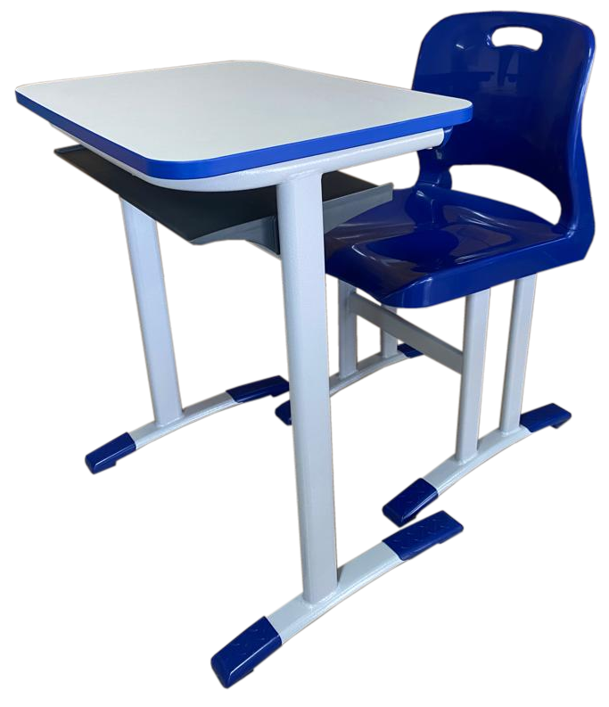 LJL5080 - Conjunto escolar, tampo em fórmica com bordas em PVC, colunas verticais em tubo oblongo 29x58, ch. 1.2, base inferior em tubo oblongo 20x48, ch. 1.2, base do tampo em tubo 1” 1/4, ch. 1.25. Fixação do tampo com 6 parafusos 5x45, porta livros em polipropileno. Cadeira, estrutura em tubo oblongo 20x48, ch. 1.2, suporte do assento e encosto em tubo 7/8, ch. 1.50, assento e encosto em polipropileno, ponteiras para proteção da base.