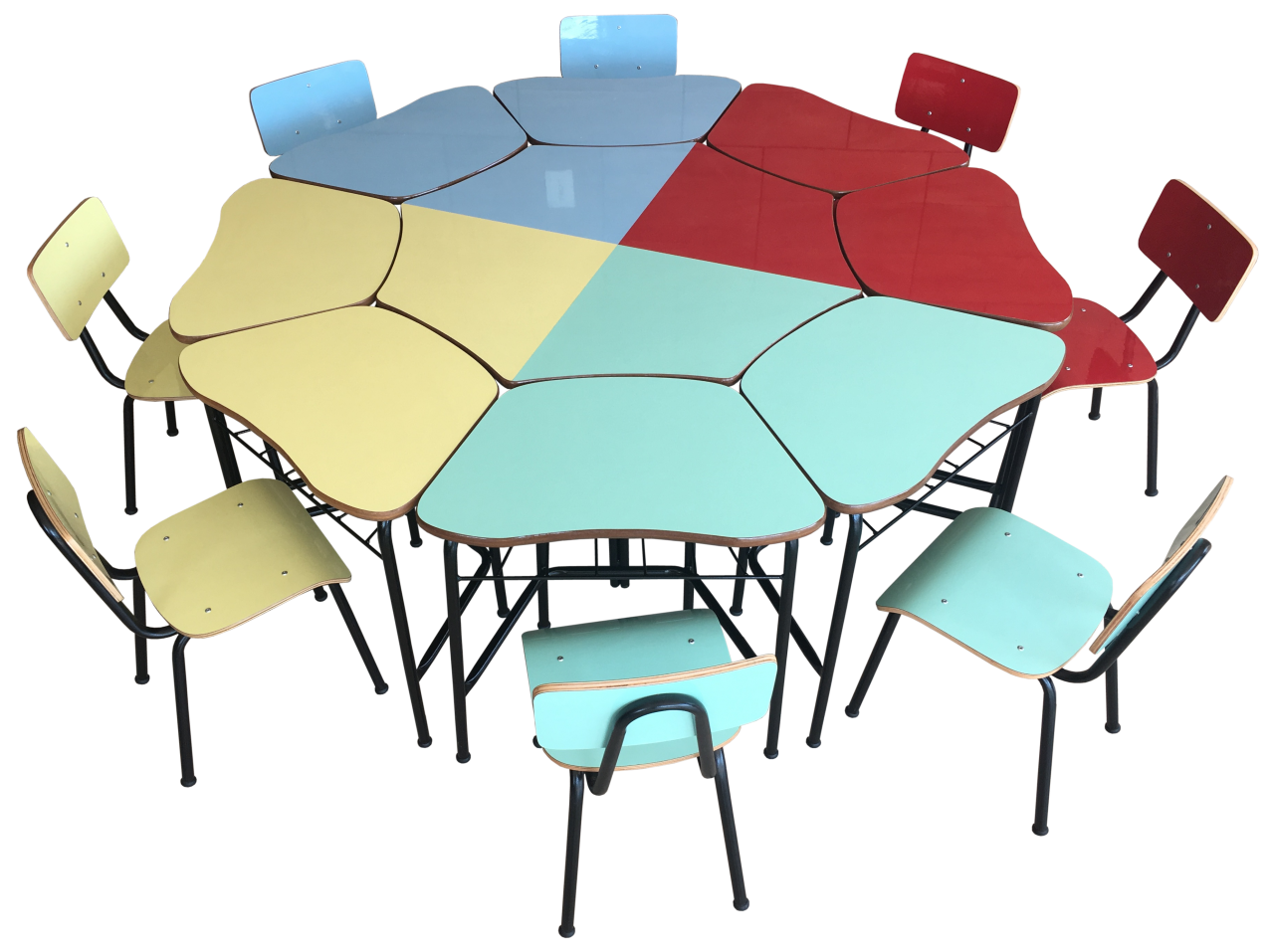 LJL5028 - Composição formada por oito carteiras, uma mesa de centro, e oito cadeiras. Modelo infantil, tampos, assento e encosto em multi laminas com formicas coloridas. Estrutura tubular ¾, porta livros, tratamento anti-ferrugem, pintura epóxi.
