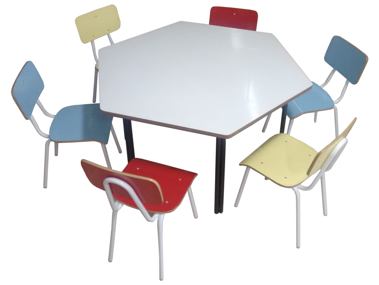 LJL5016 – Conjunto infantil coletivo de seis lugares. Mesa: tampo em MDF revestido com fórmica, estrutura tubular monobloco 7/8. Cadeira: estrutura tubular ¾, assento e encosto anatômico multilamina revestido em fórmica colorida. Tratamento anti ferrugem, pintura epóxi.
