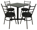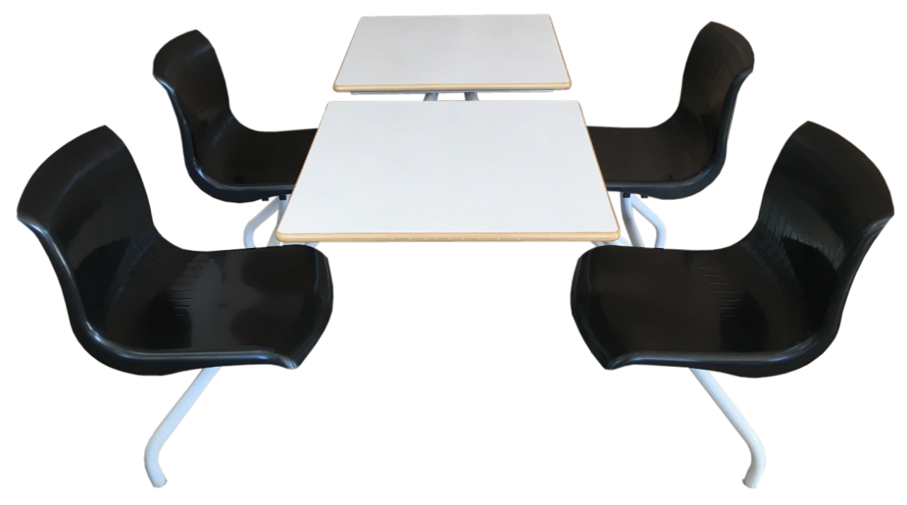 LJL5237 - Conjunto refeitório 4 lugares, estrutura monobloco em tubo de aço ¼, ch. 1.55, tratamento anti-ferrugem, pintura epóxi, ponteiras de acabamento. Tampo em MDF 18mm revestido em fórmica, bordas 180° com acabamento em selador e verniz. Assento e encosto em formato de concha fixado na estrutura através de 4 parafusos.